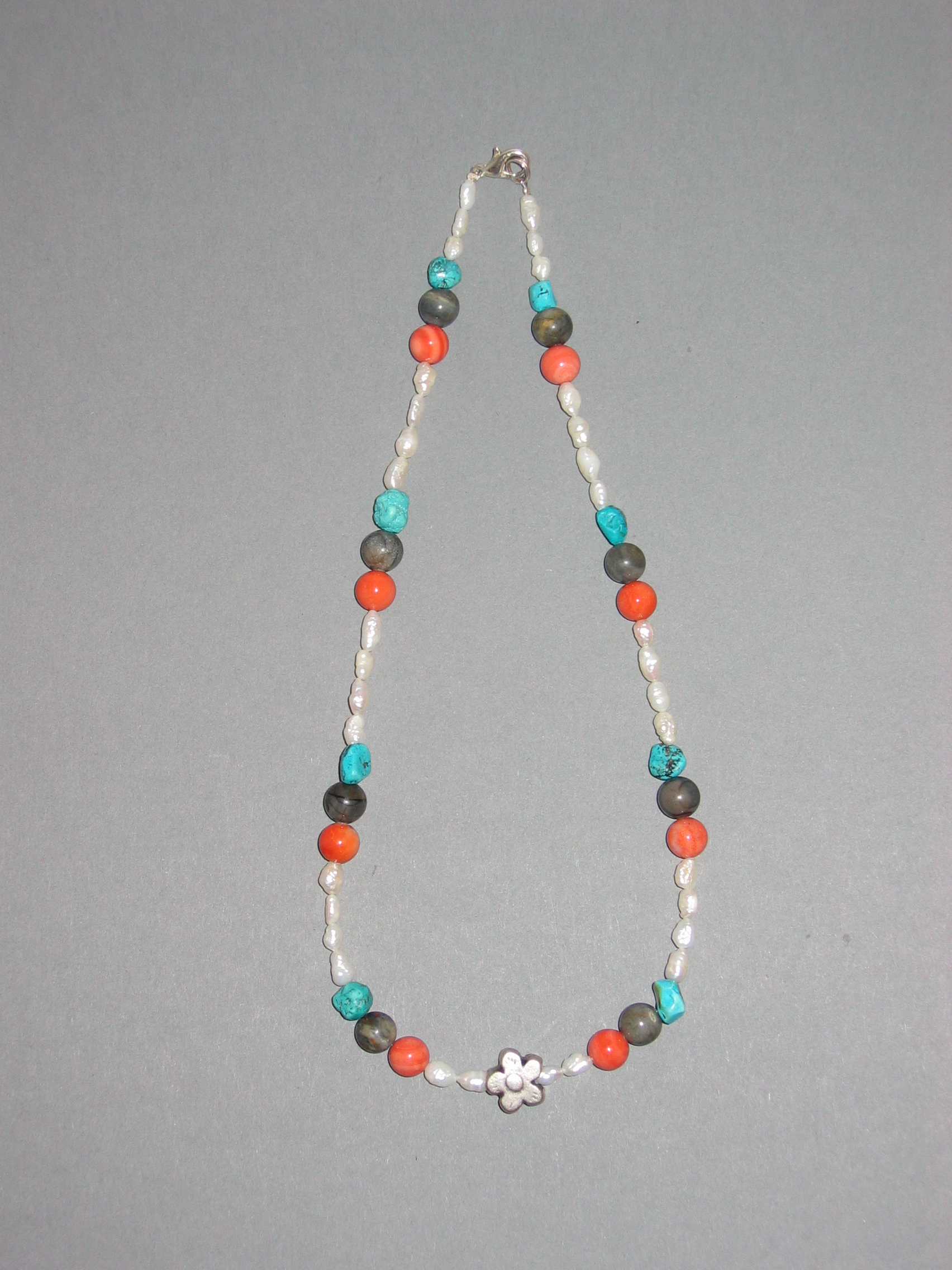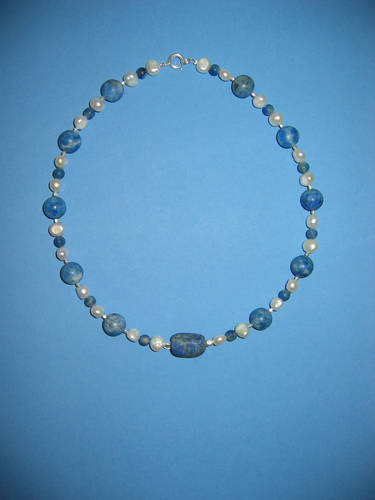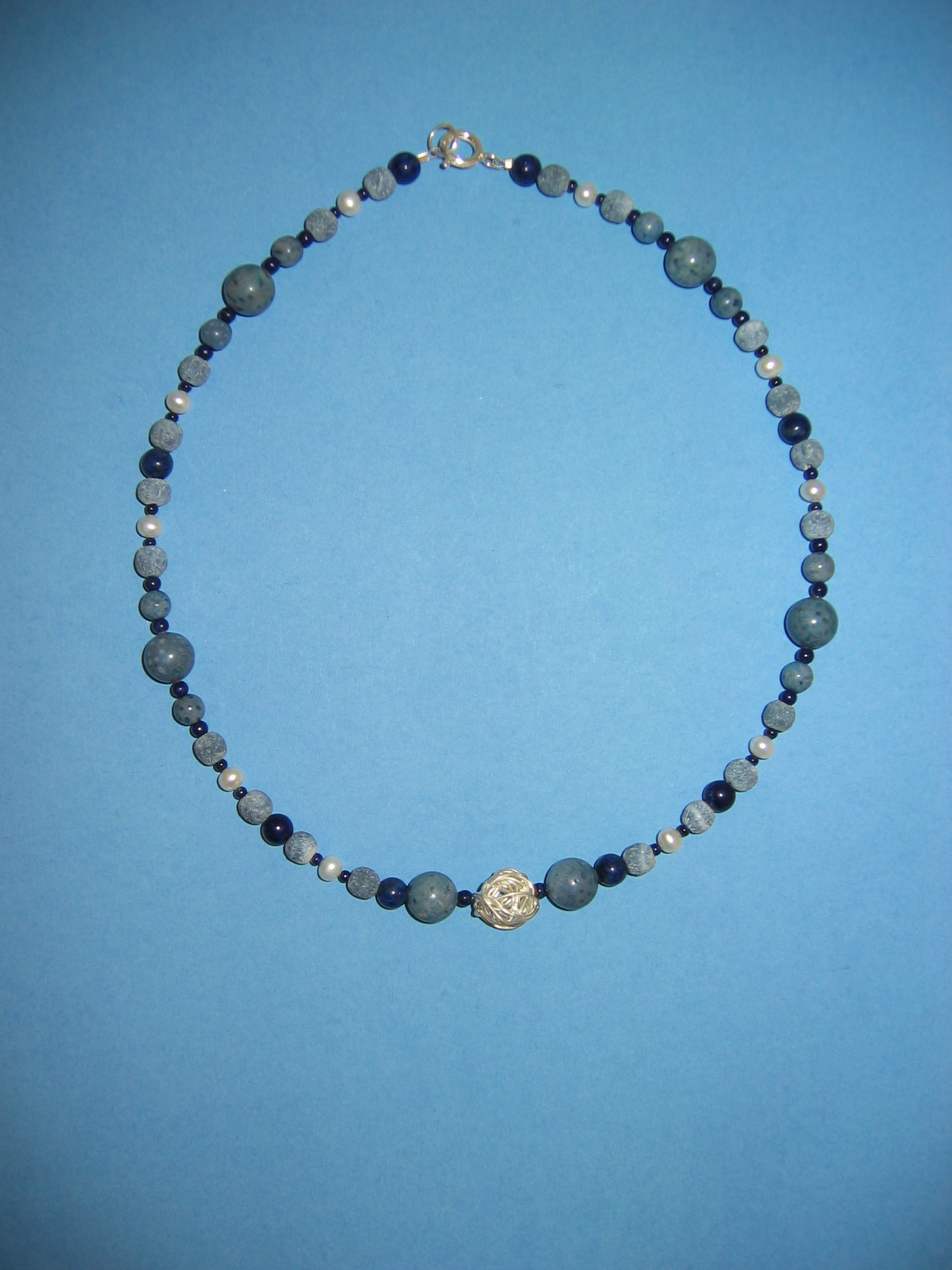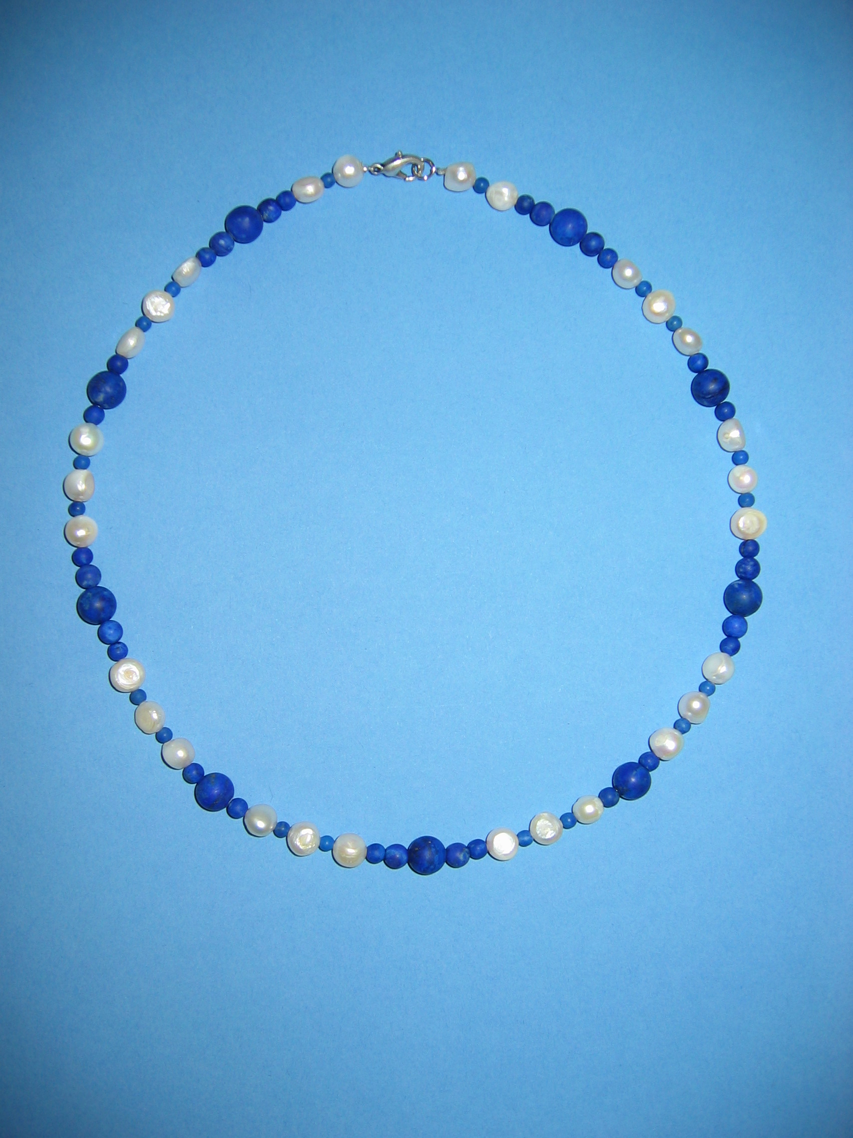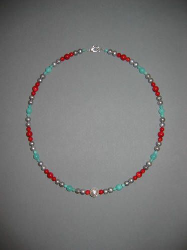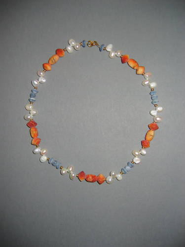 Koralle blau matt und poliert, Lapislazuli, Silber, Süßwasserperlen | |