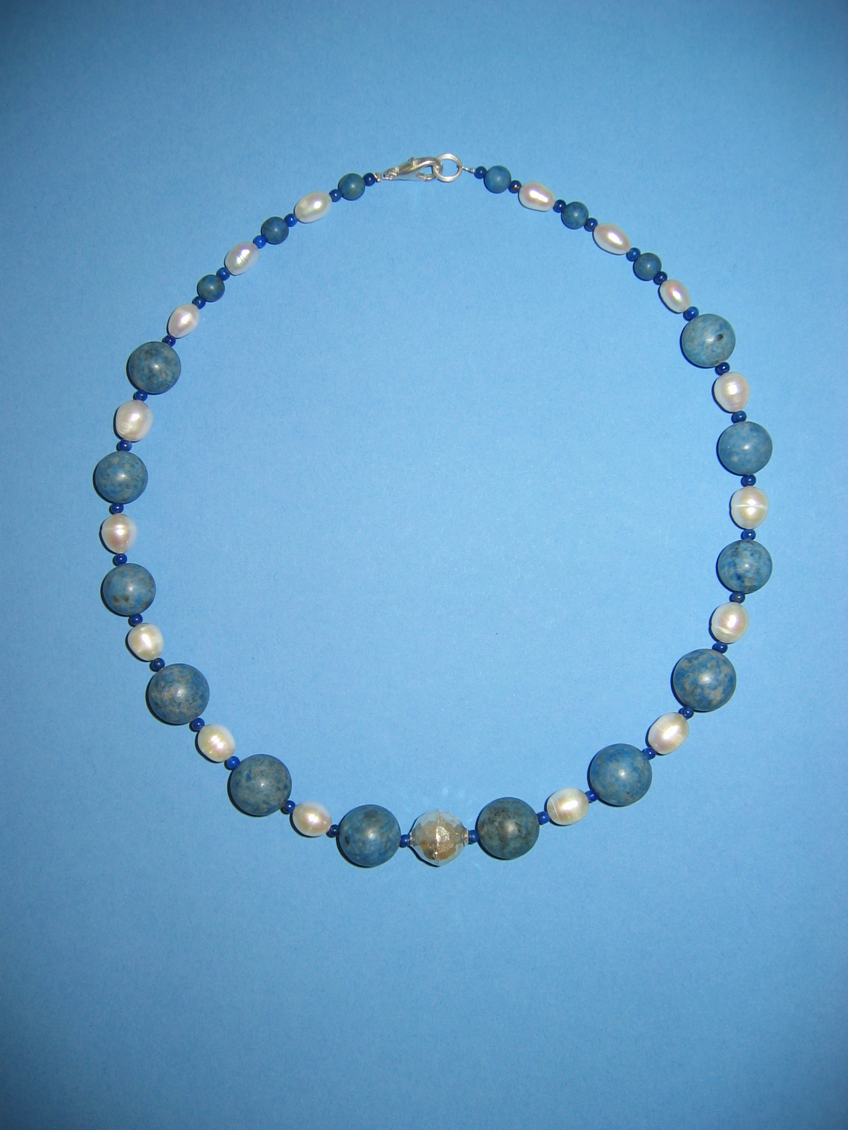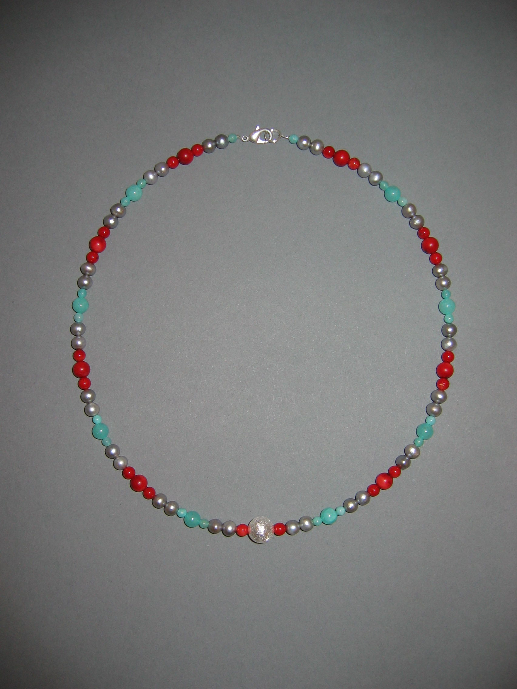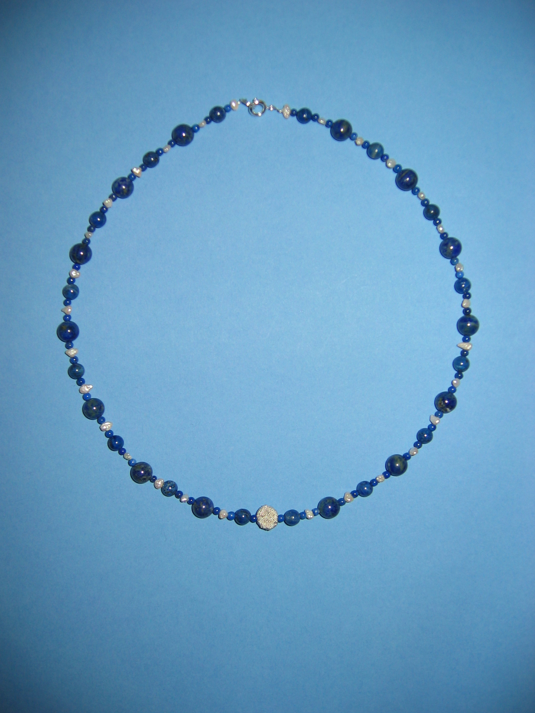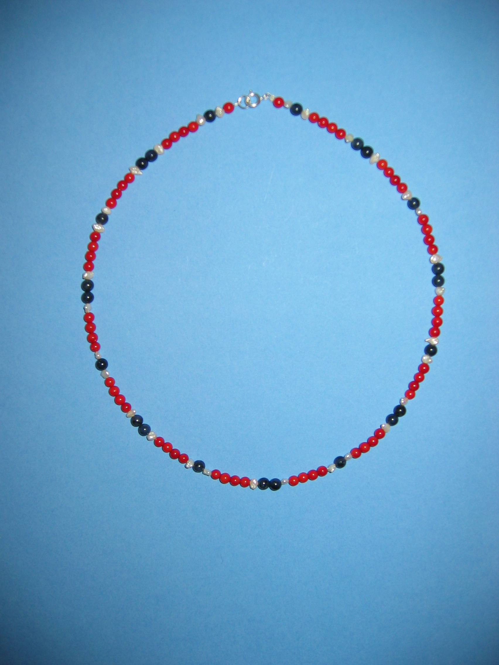 Koralle blau matt und poliert, Lapislazuli, Silber, Süßwasserperlen | |