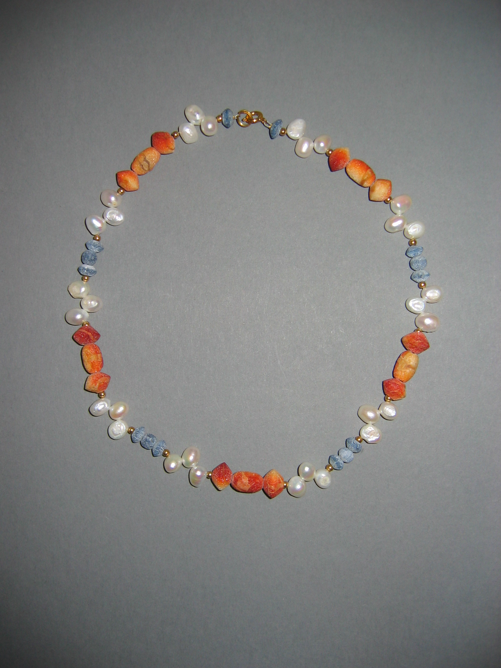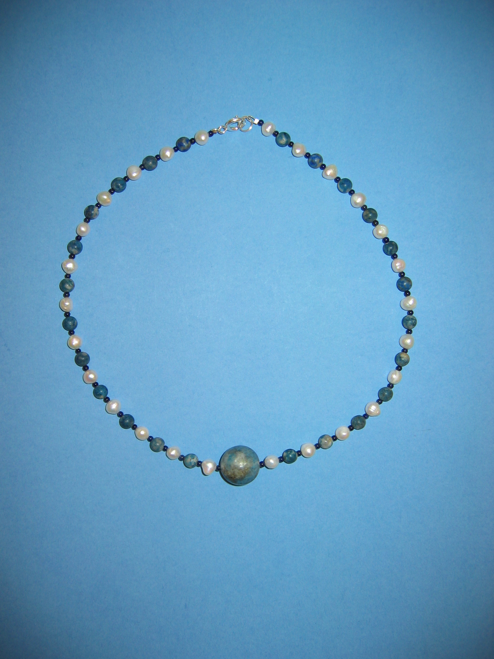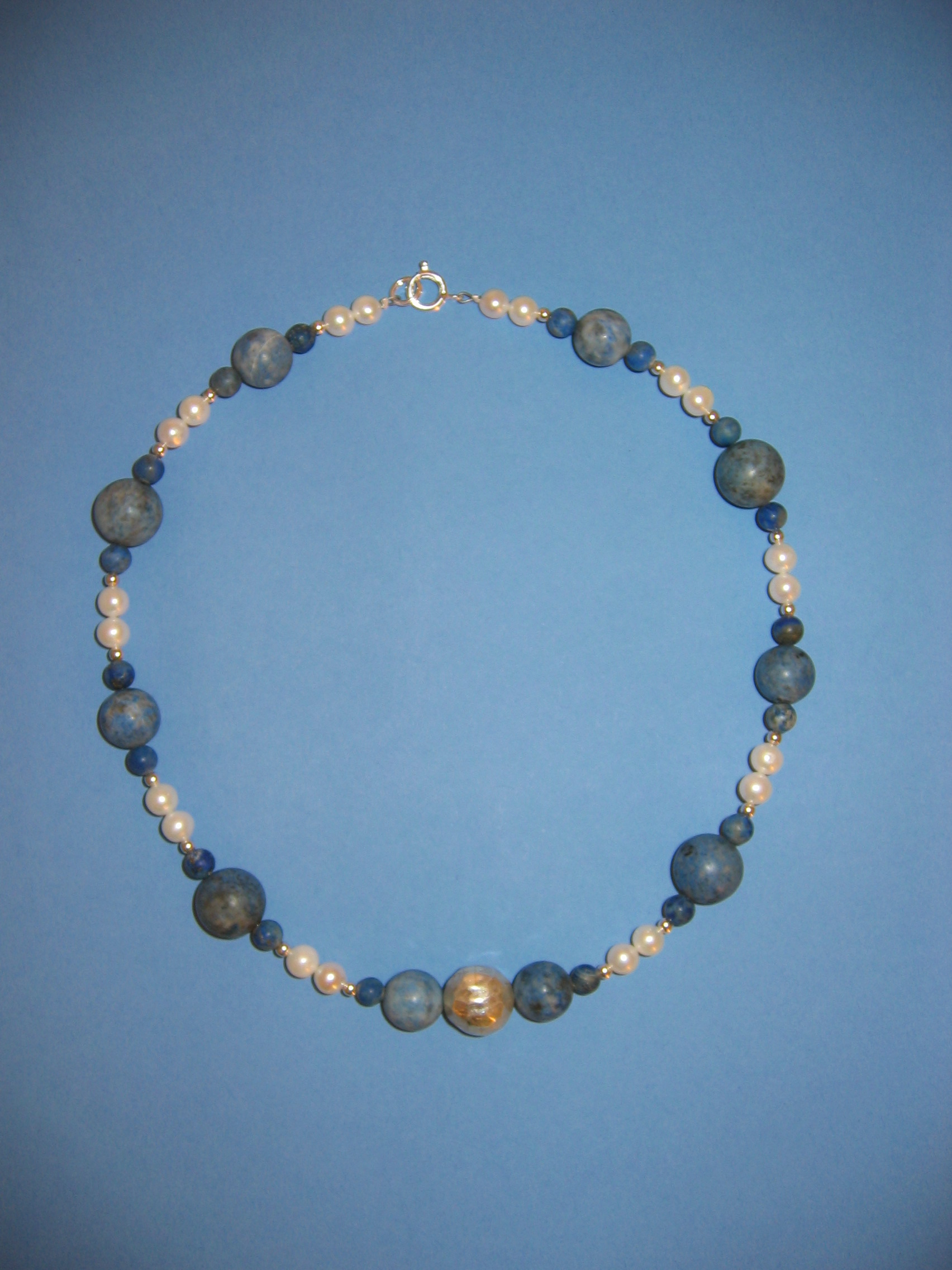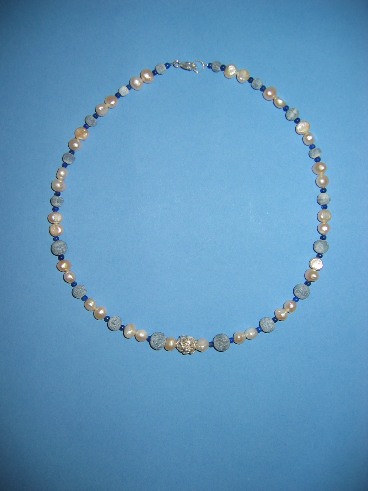 Koralle blau matt und poliert, Lapislazuli, Silber, Süßwasserperlen | |