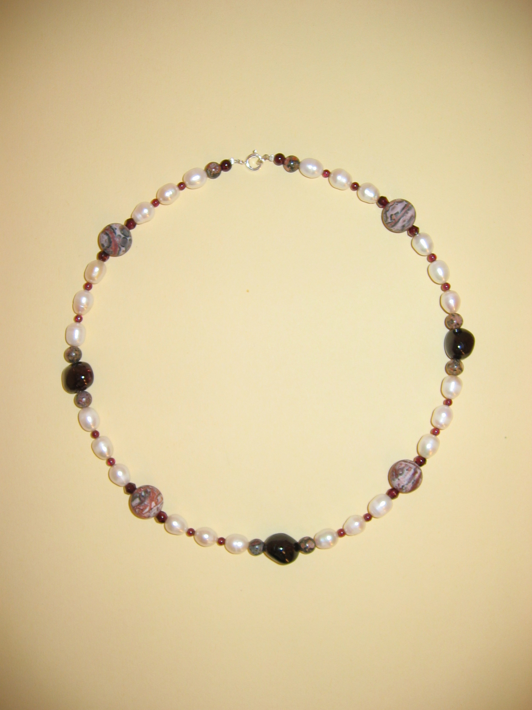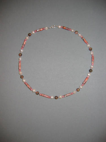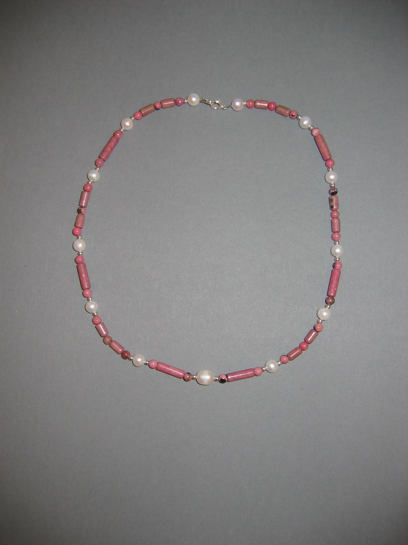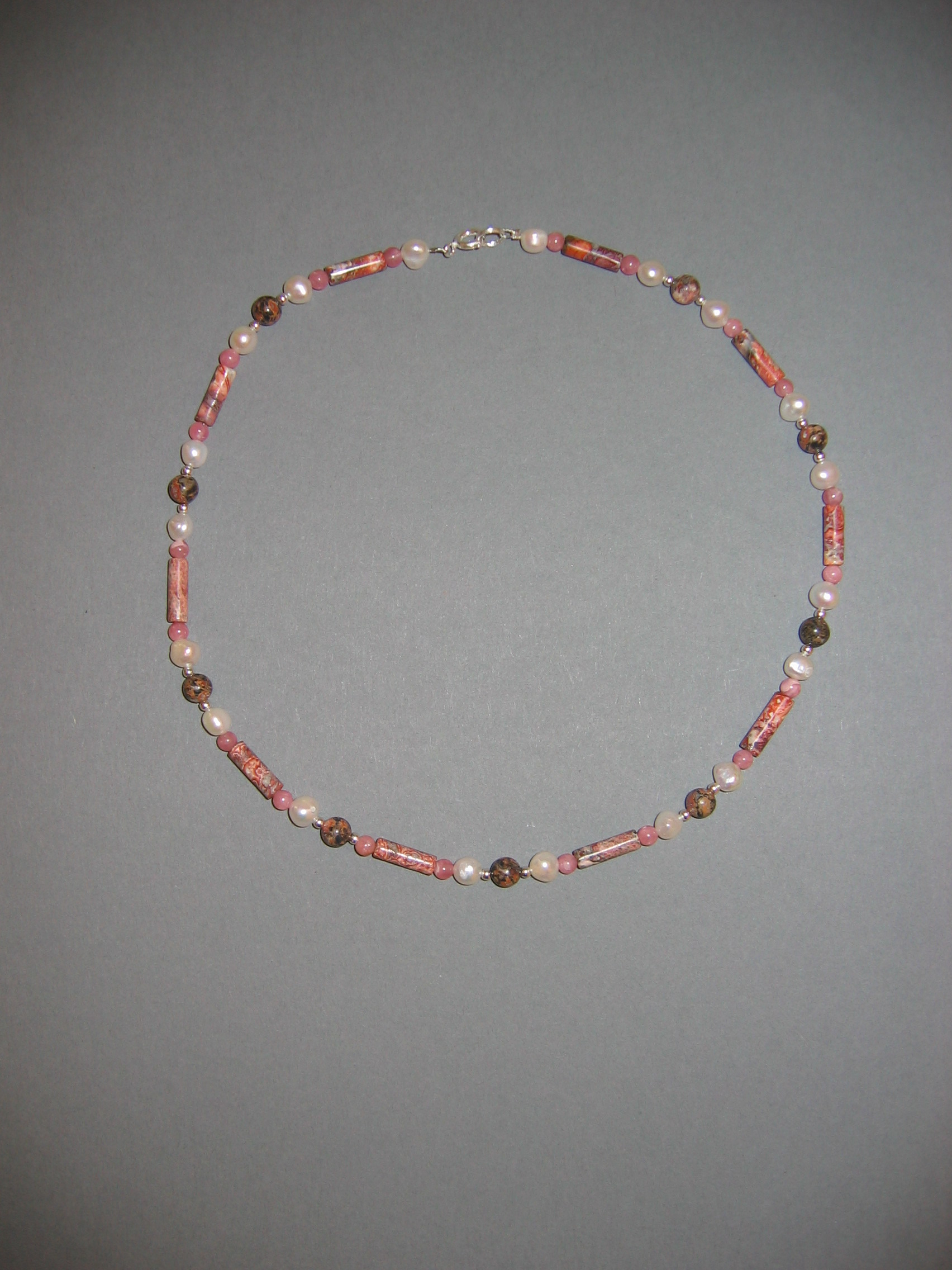 Leopardenjaspis, Rhodochrosit, Süßwasserperlen, Silber | |